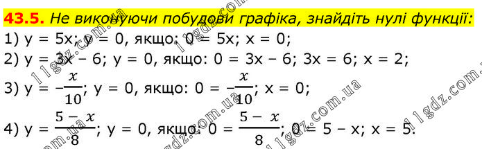 He виконуючи побудови графіка, знайдіть нулі функції: 1) y = 5х; у = 0, якщо: 0 = 5х; х = 0; 2) y = 3х – 6; y = 0, якщо: 0 = 3х – 6; 3x = 6; x = 2; 3) y = –x/10; у = 0, якщо: 0 = –x/10; х = 0; 4) y = (5 - x)/8; y = 0, якщо: 0 = (5 - x)/8; 0 = 5 – x; x = 5.