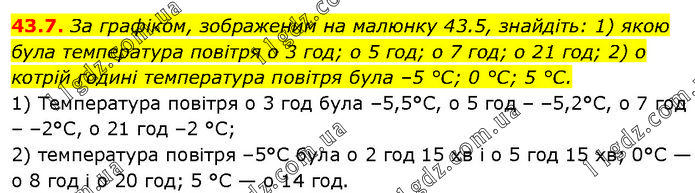 За графіком, зображеним на малюнку 43.5, знайдіть: 1) якою була температура повітря о 3 год; о 5 год; о 7 год; о 21 год; 2) о котрій годині температура повітря була –5 °С; 0 °С; 5 °С. 1) Температура повітря о 3 год була –5,5°С, о 5 год – –5,2°С, о 7 год – –2°С, о 21 год –2 °С; 2) температура повітря –5°С була о 2 год 15 хв і о 5 год 15 хв; 0°С — о 8 год і о 20 год; 5 °С — о 14 год.