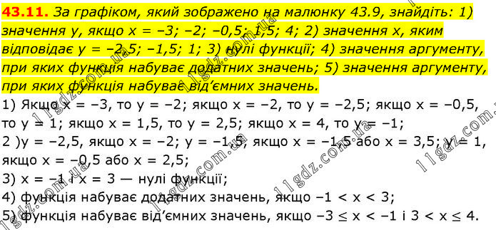 За графіком, який зображено на малюнку 43.9, знайдіть: 1) значення у, якщо х = –3; –2; –0,5; 1,5; 4; 2) значення х, яким відповідає у = –2,5; –1,5; 1; 3) нулі функції; 4) значення аргументу, при яких функція набуває додатних значень; 5) значення аргументу, при яких функція набуває від’ємних значень. 1) Якщо х = –3, то у = –2; якщо х = –2, то у = –2,5; якщо х = –0,5, то у = 1; якщо х = 1,5, то у = 2,5; якщо х = 4, то у = –1; 2) у = –2,5, якщо х = –2; у = –1,5, якщо х = –1,5 або х = 3,5; у = 1, якщо х = –0,5 або х = 2,5; 3) х = –1 і х = 3 — нулі функції; 4) функція набуває додатних значень, якщо –1 < х < 3; 5) функція набуває від’ємних значень, якщо –3 ≤ х < –1 і 3 < х ≤ 4.