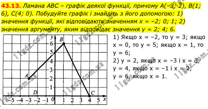 Ламана ABC – графік деякої функції, причому А(–3; 2), B(1; 6), С(4; 0). Побудуйте графік і знайдіть з його допомогою: 1) значення функції, які відповідають значенням х = –2; 0; 1; 2) значення аргументу, яким відповідає значення у = 2; 4; 6. 1) Якщо х = –2, то у = 3; якщо x = 0, тo y = 5; якщо х = 1, то у = 6; 2) у = 2, якщо x = –3 і х = 3; у = 4, якщо x = –1 і х = 2; у = 6, якщо х = 1.
