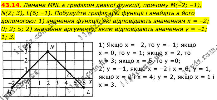Ламана MNL є графіком деякої функції, причому М(–2; –1), N(2; 3), L(6; –1). Побудуйте графік цієї функції і знайдіть з його допомогою: 1) значення функції, які відповідають значенням х = –2; 0; 2; 5; 2) значення аргументу, яким відповідають значення у = –1; 1; 3. 1) Якщо х = –2, то у = –1; якщо x = 0, то у = 1; якщо х = 2, то у = 3; якщо х = 5, то y = 0; 2) у = –1, якщо x = –2 і x = 6; у = 1, якщо x = 0 і x = 4; у = 2, якщо x = 1 і x = 3.