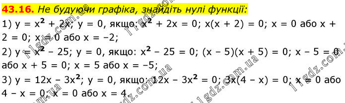 He будуючи графіка, знайдіть нулі функції: 1) у = x2 + 2х; у = 0, якщо: x2 + 2x = 0; x(x + 2) = 0; x = 0 або x + 2 = 0; x = 0 або х = –2; 2) у = x2 – 25; у = 0, якщо: x2 – 25 = 0; (х – 5)(x + 5) = 0; x – 5 = 0 або x + 5 = 0; x = 5 або x = –5; 3) у = 12x – 3x2; у = 0, якщо: 12x – 3x2 = 0; 3x(4 – x) = 0; х = 0 або 4 – х = 0; x = 0 або х = 4.