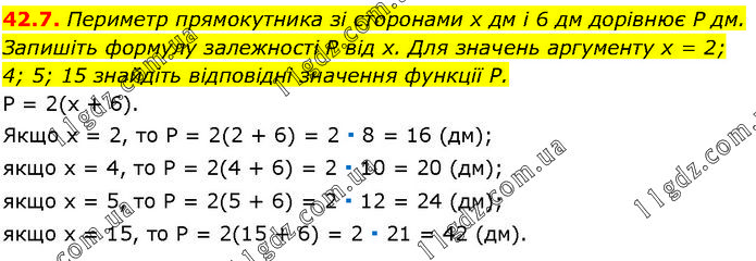 Периметр прямокутника зі сторонами х дм і 6 дм дорівнює P дм. Запишіть формулу залежності P від х. Для значень аргументу х = 2; 4; 5; 15 знайдіть відповідні значення функції Р. Р = 2(х + 6). Якщо x = 2, то P = 2(2 + 6) = 2 ∙ 8 = 16 (дм); якщо x = 4, то P = 2(4 + 6) = 2 ∙ 10 = 20 (дм); якщо x = 5, то P = 2(5 + 6) = 2 ∙ 12 = 24 (дм); якщо x = 15, то P = 2(15 + 6) = 2 ∙ 21 = 42 (дм).