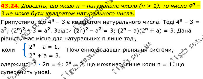 Доведіть, що якщо n – натуральне число (n > 1), то число 4n – 3 не може бути квадратом натурального числа. Припустимо, що 4n – 3 є квадратом натурального числа. Тоді 4n – 3 = а2; (2n)2 – 3 = a2. Звідси (2n)2 – а2 = 3; (2n – а)(2n + а) = 3. Дана рівність має місце для натуральних n лише тоді, 2n – a = 1, 2n + a = 3. одержимо: 2 ∙ 2n = 4; 2n = 2, що можливо, лише коли n = 1, що суперечить умові.