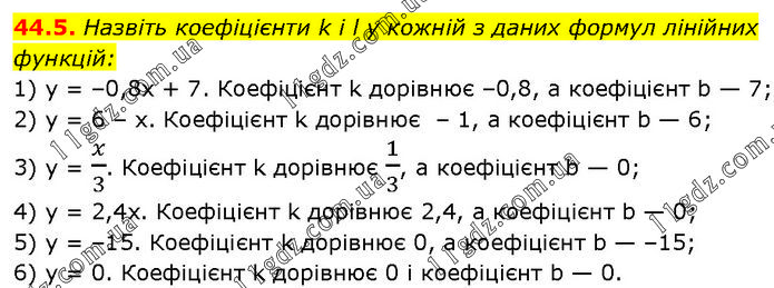 Назвіть коефіцієнти k і l у кожній з даних формул лінійних функцій: 1) у = –0,8х + 7. Коефіцієнт k дорівнює –0,8, а коефіцієнт b — 7; 2) у = 6 – х. Коефіцієнт k дорівнює – 1, а коефіцієнт b — 6; 3) y = x/3. Коефіцієнт k дорівнює 1/3, а коефіцієнт b — 0; 4) у = 2,4х. Коефіцієнт k дорівнює 2,4, а коефіцієнт b — 0; 5) у = –15. Коефіцієнт k дорівнює 0, а коефіцієнт b — –15; 6) у = 0. Коефіцієнт k дорівнює 0 і коефіцієнт b — 0.
