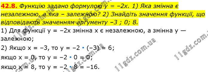 Функцію задано формулою у = –2х. 1) Яка змінна є незалежною, а яка – залежною? 2) Знайдіть значення функції, що відповідають значенням аргументу –3 ; 0; 8. 1) Для функції y = –2х змінна x є незалежною, а змінна y — залежною; 2) Якщо x = –3, то у = –2 ∙ (–3) = 6; якщо х = 0, то у = –2 ∙ 0 = 0; якщо x = 8, то у = –2 ∙ 8 = –16.