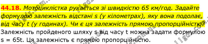 Мотоциклістка рухається зі швидкістю 65 км/год. Задайте формулою залежність відстані s (у кілометрах), яку вона подолає, від часу t (у годинах). Чи є ця залежність прямою пропорційністю? Залежність пройденого шляху s від часу t можна задати формулою s = 65t. Ця залежність є прямою пропорційністю.