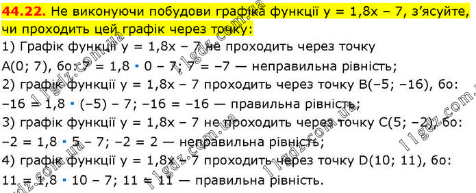 He виконуючи побудови графіка функції у = 1,8x – 7, з’ясуйте, чи проходить цей графік через точку: 1) Графік функції у = 1,8х – 7 не проходить через точку A(0; 7), бо: 7 = 1,8 ∙ 0 – 7; 7 = –7 — неправильна рівність; 2) графік функції у = 1,8x – 7 проходить через точку В(–5; –16), бо: –16 = 1,8 ∙ (–5) – 7; –16 = –16 — правильна рівність; 3) графік функції y = 1,8х – 7 не проходить через точку С(5; –2), бо: –2 = 1,8 ∙ 5 – 7; –2 = 2 — неправильна рівність; 4) графік функції у = 1,8x – 7 проходить через точку D(10; 11), бо: 11 = 1,8 ∙ 10 – 7; 11 = 11 — правильна рівність.