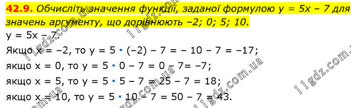 Обчисліть значення функції, заданої формулою у = 5х – 7 для значень аргументу, що дорівнюють –2; 0; 5; 10. у = 5x – 7. Якщо x = –2, то у = 5 ∙ (–2) – 7 = – 10 – 7 = –17; якщо x = 0, то y = 5 ∙ 0 – 7 = 0 – 7= –7; якщо x = 5, то y = 5 ∙ 5 – 7 = 25 – 7 = 18; якщо x = 10, то y = 5 ∙ 10 – 7 = 50 – 7 = 43.