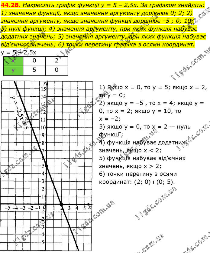 Накресліть графік функції у = 5 – 2,5x. За графіком знайдіть: 1) значення функції, якщо значення аргументу дорівнює 0; 2; 2) значення аргументу, якщо значення функції дорівнює –5 ; 0; 10; 3) нулі функції; 4) значення аргументу, при яких функція набуває додатних значень; 5) значення аргументу, при яких функція набуває від’ємних значень; 6) точки перетину графіка з осями координат. y = 5 – 2,5x. 1) Якщо х = 0, то у = 5; якщо х = 2, то y = 0; 2) якщо у = –5 , то х = 4; якщо у = 0, то х = 2; якщо у = 10, то х = –2; 3) якщо у = 0, то х = 2 — нуль функції; 4) функція набуває додатних значень, якщо х < 2; 5) функція набуває від’ємних значень, якщо х > 2; 6) точки перетину з осями координат: (2; 0) і (0; 5).