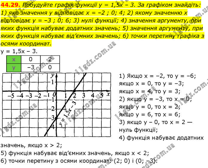 Побудуйте графік функції у = 1,5х – 3. За графіком знайдіть: 1) яке значення у відповідає х = –2 ; 0; 4; 2) якому значенню х відповідає у = –3 ; 0; 6; 3) нулі функції; 4) значення аргументу, при яких функція набуває додатних значень; 5) значення аргументу, при яких функція набуває від’ємних значень; 6) точки перетину графіка з осями координат. у = 1,5х – 3. 1) Якщо х = –2, то у = –6; якщо х = 0, то у = –3; якщо х = 4, то у = 3; 2) якщо y = –3, то х = 0; якщо у = 0, то х = 2; якщо у = 6, то х = 6; 3) якщо у – 0, то х = 2 — нуль функції; 4) функція набуває додатних значень, якщо х > 2; 5) функція набуває від’ємних значень, якщо х < 2; 6) точки перетину з осями координат: (2; 0) і (0; –3).