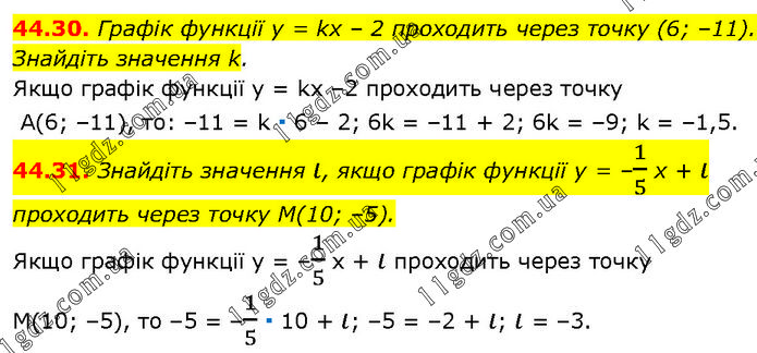 44.30. Графік функції у = kx – 2 проходить через точку (6; –11). Знайдіть значення k. Якщо графік функції у = kх –2 проходить через точку А(6; –11), то: –11 = k ∙ 6 – 2; 6k = –11 + 2; 6k = –9; k = –1,5. 44.31. Знайдіть значення ι, якщо графік функції у = –1/5 x + ι проходить через точку М(10; –5). Якщо графік функції у = –1/5 x + ι проходить через точку М(10; –5), то –5 = –1/5 ∙ 10 + ι; –5 = –2 + ι; ι = –3.