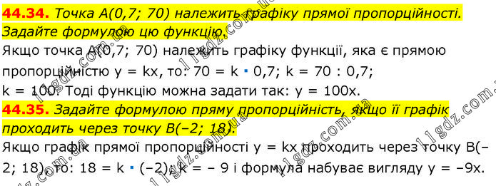 44.34. Точка А(0,7; 70) належить графіку прямої пропорційності. Задайте формулою цю функцію. Якщо точка A(0,7; 70) належить графіку функції, яка є прямою пропорційністю у = kх, то: 70 = k ∙ 0,7; k = 70 : 0,7; k = 100. Тоді функцію можна задати так: y = 100x. 44.35. Задайте формулою пряму пропорційність, якщо її графік проходить через точку B(–2; 18). Якщо графік прямої пропорційності у = kх проходить через точку В(–2; 18), то: 18 = k ∙ (–2); k = – 9 і формула набуває вигляду у = –9х.