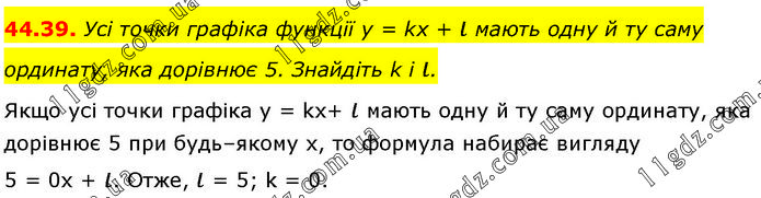 Усі точки графіка функції у = kx + ι мають одну й ту саму ординату, яка дорівнює 5. Знайдіть k і ι. Якщо усі точки графіка у = kх+ ι мають одну й ту саму ординату, яка дорівнює 5 при будь–якому х, то формула набирає вигляду 5 = 0x + ι. Отже, ι = 5; k = 0.