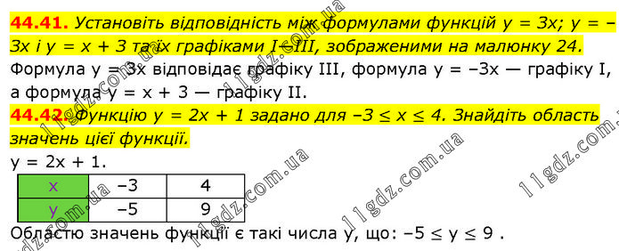 44.41. Установіть відповідність між формулами функцій у = Зх; у = –Зх і у = х + З та їх графіками I—III, зображеними на малюнку 24. Формула у = Зх відповідає графіку III, формула у = –Зх — графіку І, а формула у = х + 3 — графіку II. 44.42. Функцію у = 2х + 1 задано для –З ≤ х ≤ 4. Знайдіть область значень цієї функції. у = 2х + 1. Областю значень функції є такі числа у, що: –5 ≤ у ≤ 9.