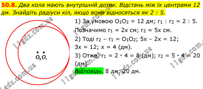 Два кола мають внутрішній дотик. Відстань між їх центрами 12 дм. Знайдіть радіуси кіл, якщо вони відносяться як 2 : 5. 1) За умовою O1O2 = 12 дм; r1 : r2 = 2 : 5. Позначимо r1 = 2x см; r2 = 5х см. 2) Тоді r2 – r1 = O1O2; 5х – 2х = 12; Зх = 12; х = 4 (дм). 3) Отже, r1 = 2 ∙ 4 = 8 (дм); r2 = 5 ∙ 4 = 20 (дм). Відповідь. 8 дм; 20 дм.