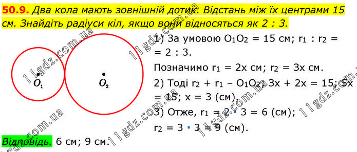 Два кола мають зовнішній дотик. Відстань між їх центрами 15 см. Знайдіть радіуси кіл, якщо вони відносяться як 2 : 3. 1) За умовою O1O2 = 15 см; r1 : r2 = 2 : 3. Позначимо r1 = 2х см; r2 = Зх см. 2) Тоді r2 + r1 – O1O2; Зх + 2х = 15; 5х = 15; х = 3 (см). 3) Отже, r1 = 2 ∙ 3 = 6 (см); r2 = 3 ∙ 3 = 9 (см). Відповідь. 6 см; 9 см.