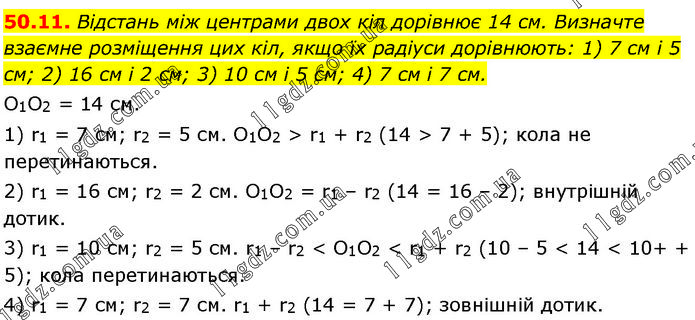 Відстань між центрами двох кіл дорівнює 14 см. Визначте взаємне розміщення цих кіл, якщо їх радіуси дорівнюють: 1) 7 см і 5 см; 2) 16 см і 2 см; 3) 10 см і 5 см; 4) 7 см і 7 см. O1O2 = 14 см. 1) r1 = 7 см; r2 = 5 см. O1O2 > r1 + r2 (14 > 7 + 5); кола не перетинаються. 2) r1 = 16 см; r2 = 2 см. O1O2 = r1 – r2 (14 = 16 – 2); внутрішній дотик. 3) r1 = 10 см; r2 = 5 см. r1 – r2 < O1O2 < r1 + r2 (10 – 5 < 14 < 10 + 5); кола перетинаються. 4) r1 = 7 см; r2 = 7 см. r1 + r2 (14 = 7 + 7); зовнішній дотик.