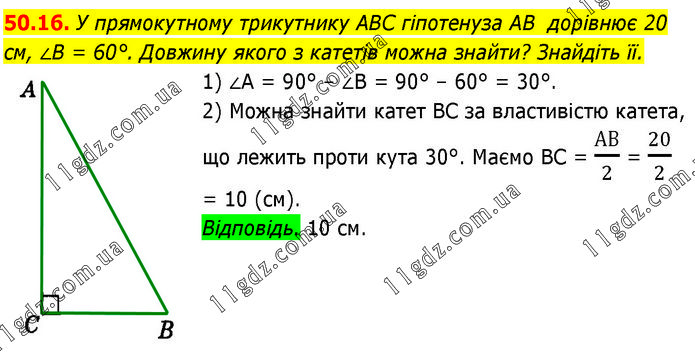 У прямокутному трикутнику ABC гіпотенуза AB дорівнює 20 см, ∠B = 60°. Довжину якого з катетів можна знайти? Знайдіть її. 1) ∠A = 90° – ∠B = 90° – 60° = 30°. 2) Можна знайти катет BC за властивістю катета, що лежить проти кута 30°. Маємо BC = АВ/2 = 20/2 = 10 (см). Відповідь. 10 см.