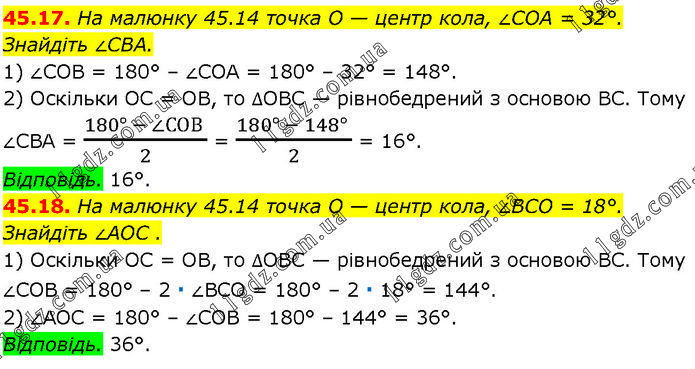 45.17. На малюнку 45.14 точка O — центр кола, ∠COA = 32°. Знайдіть ∠CBA. 1) ∠COB = 180° – ∠COA = 180° – 32° = 148°. 2) Оскільки OC = OB, то ∆OBC — рівнобедрений з основою BC. Тому ∠CBA = (180° - ∠СОВ )/2 = (180° - 148° )/2 = 16°. Відповідь. 16°. 45.18. На малюнку 45.14 точка O — центр кола, ∠BCO = 18°. Знайдіть ∠AOC . 1) Оскільки OC = OB, то ∆OBC — рівнобедрений з основою BC. Тому ∠COB = 180° – 2 ∙ ∠BCO = 180° – 2 ∙ 18° = 144°. 2) ∠AOC = 180° – ∠COB = 180° – 144° = 36°. Відповідь. 36°.