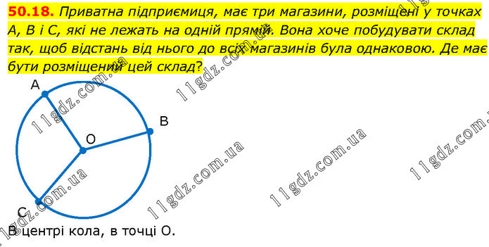 Приватна підприємиця, має три магазини, розміщені у точках А, В і С, які не лежать на одній прямій. Вона хоче побудувати склад так, щоб відстань від нього до всіх магазинів була однаковою. Де має бути розміщений цей склад? В центрі кола, в точці О.