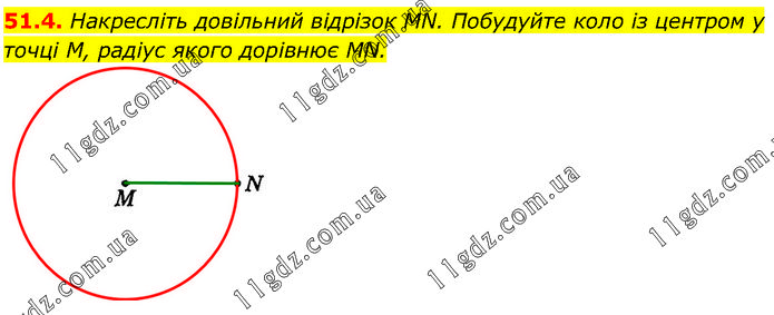 Накресліть довільний відрізок MN. Побудуйте коло із центром у точці М, радіус якого дорівнює MN.