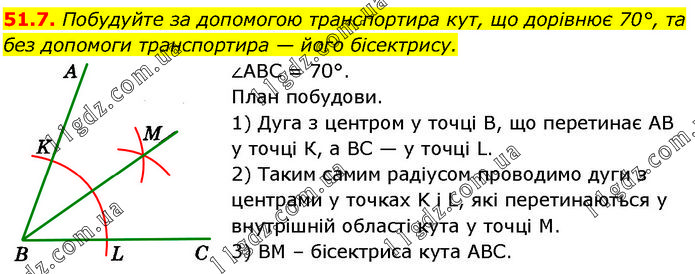 Побудуйте за допомогою транспортира кут, що дорівнює 70°, та без допомоги транспортира — його бісектрису. ∠ABC = 70°. План побудови. 1) Дуга з центром у точці В, що перетинає AB у точці К, a BC — у точці L. 2) Таким самим радіусом проводимо дуги з центрами у точках K і L, які перетинаються у внутрішній області кута у точці М. 3) BM – бісектриса кута ABC.