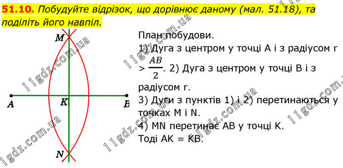 Побудуйте відрізок, що дорівнює даному (мал. 51.18), та поділіть його навпіл. План побудови. 1) Дуга з центром у точці А і з радіусом r > AB/2. 2) Дуга з центром у точці В і з радіусом r. 3) Дуги з пунктів 1) і 2) перетинаються у точках M і N. 4) MN перетинає AB у точці K. Тоді AK = KB.
