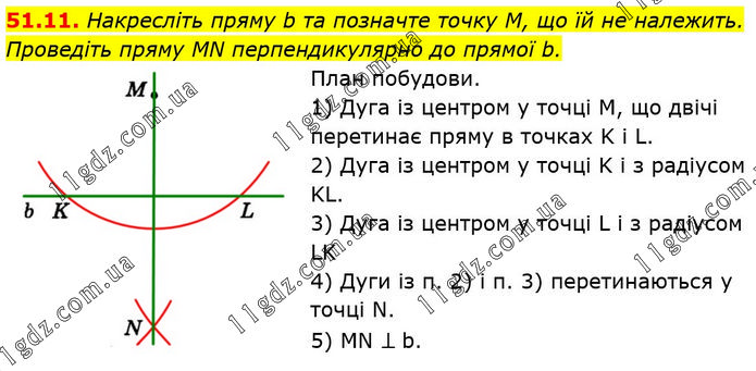 Накресліть пряму b та позначте точку М, що їй не належить. Проведіть пряму MN перпендикулярно до прямої b. План побудови. 1) Дуга із центром у точці М, що двічі перетинає пряму в точках K і L. 2) Дуга із центром у точці K і з радіусом KL. 3) Дуга із центром у точці L і з радіусом LK 4) Дуги із п. 2) і п. 3) перетинаються у точці N. 5) MN ⊥ b.