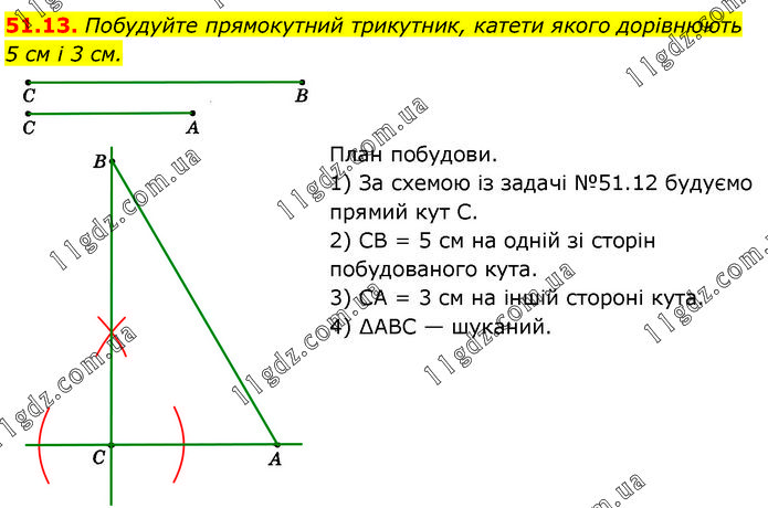Побудуйте прямокутний трикутник, катети якого дорівнюють 5 см і 3 см. План побудови. 1) За схемою із задачі №51.12 будуємо прямий кут С. 2) CB = 5 см на одній зі сторін побудованого кута. 3) CA = 3 см на іншій стороні кута. 4) ∆ABC — шуканий.