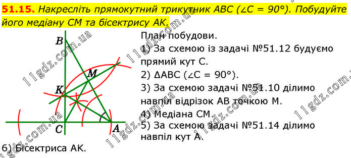 Накресліть прямокутний трикутник ABC (∠C = 90°). Побудуйте його медіану CM та бісектрису AK. План побудови. 1) За схемою із задачі №51.12 будуємо прямий кут С. 2) ∆ABC (∠C = 90°). 3) За схемою задачі №51.10 ділимо навпіл відрізок AB точкою М. 4) Медіана CM. 5) За схемою задачі №51.14 ділимо навпіл кут А. 6) Бісектриса AK.