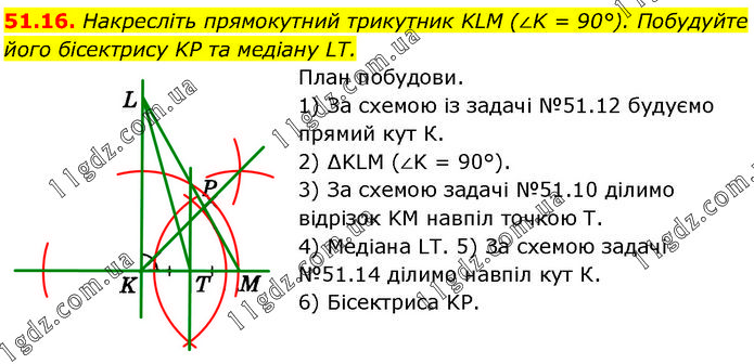Накресліть прямокутний трикутник KLM (∠K = 90°). Побудуйте його бісектрису KP та медіану LT. План побудови. 1) За схемою із задачі №51.12 будуємо прямий кут К. 2) ∆KLM (∠K = 90°). 3) За схемою задачі №51.10 ділимо відрізок KM навпіл точкою Т. 4) Медіана LT. 5) За схемою задачі №51.14 ділимо навпіл кут К. 6) Бісектриса KP.