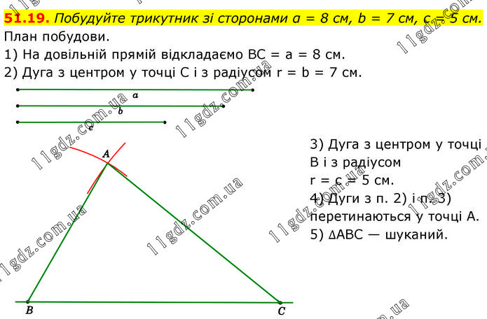 Побудуйте трикутник зі сторонами α = 8 см, b = 7 см, с = 5 см. План побудови. 1) На довільній прямій відкладаємо BC = а = 8 см. 2) Дуга з центром у точці C і з радіусом r = b = 7 см. 3) Дуга з центром у точці В і з радіусом r = с = 5 см. 4) Дуги з п. 2) і п. 3) перетинаються у точці А. 5) ∆АВС — шуканий.