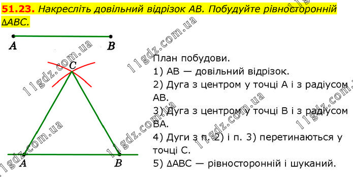 Накресліть довільний відрізок AB. Побудуйте рівносторонній ∆ABC. План побудови. 1) AB — довільний відрізок. 2) Дуга з центром у точці А і з радіусом AB. 3) Дуга з центром у точці В і з радіусом BA. 4) Дуги з п. 2) і п. 3) перетинаються у точці С. 5) ∆ABC — рівносторонній і шуканий.