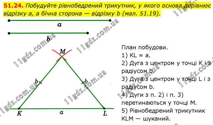 Побудуйте рівнобедрений трикутник, у якого основа дорівнює відрізку а, а бічна сторона — відрізку b (мал. 51.19). План побудови. 1) KL = а. 2) Дуга з центром у точці K i з радіусом b. 3) Дуга з центром у точці L і з радіусом b. 4) Дуги з п. 2) і п. 3) перетинаються у точці М. 5) Рівнобедрений трикутник KLM — шуканий.