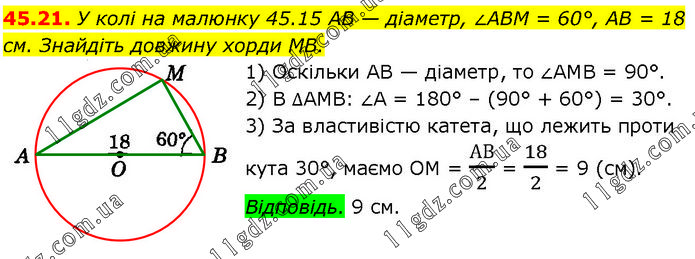 У колі на малюнку 45.15 AB — діаметр, ∠ABM = 60°, AB = 18 см. Знайдіть довжину хорди MB. 1) Оскільки AB — діаметр, то ∠AMB = 90°. 2) В ∆AMB: ∠A = 180° – (90° + 60°) = 30°. 3) За властивістю катета, що лежить проти кута 30°, маємо OM = АВ/2 = 18/2 = 9 (см). Відповідь. 9 см.