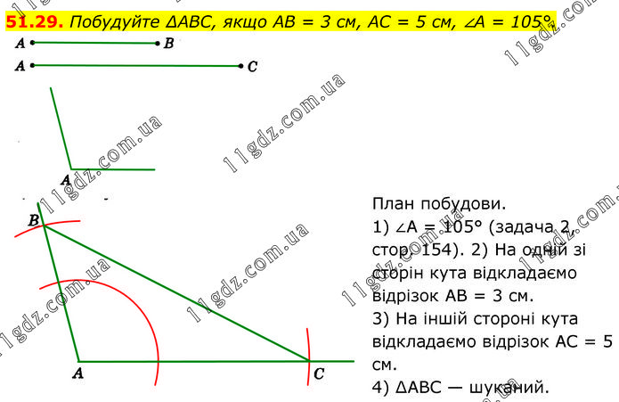 Побудуйте ΔABC, якщо AB = 3 см, AC = 5 см, ∠A = 105°. План побудови. 1) ∠A = 105° (задача 2, cтop. 154). 2) На одній зі сторін кута відкладаємо відрізок AB = 3 см. 3) На іншій стороні кута відкладаємо відрізок AC = 5 см. 4) ∆ABC — шуканий.