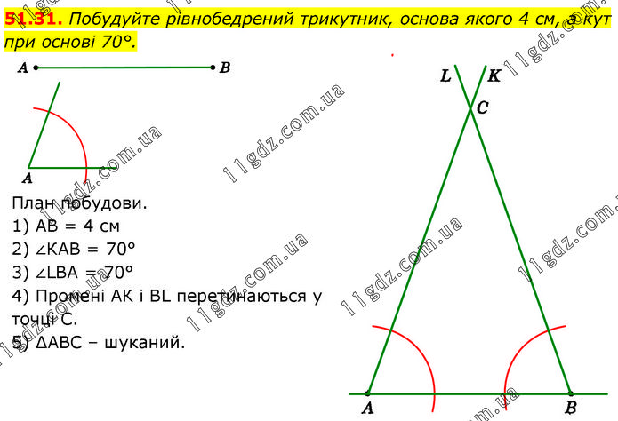 Побудуйте рівнобедрений трикутник, основа якого 4 см, а кут при основі 70°. План побудови. 1) АВ = 4 см 2) ∠КАВ = 70° 3) ∠LBA = 70° 4) Промені АК і BL перетинаються у точці С. 5) ∆АВС – шуканий.