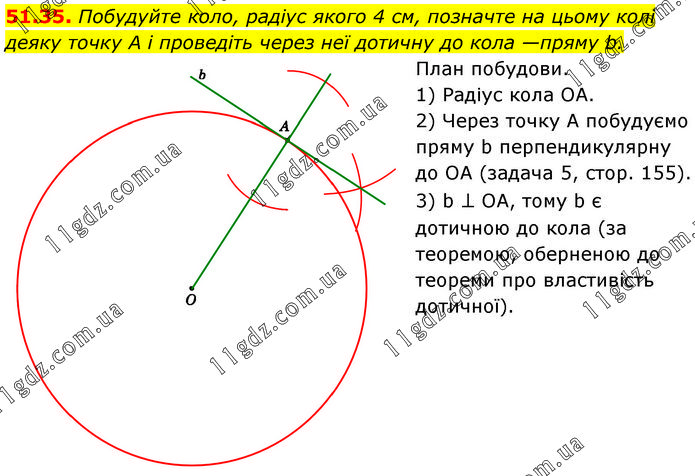 Побудуйте коло, радіус якого 4 см, позначте на цьому колі деяку точку А і проведіть через неї дотичну до кола — пряму b. План побудови. 1) Радіус кола OA. 2) Через точку А побудуємо пряму b перпендикулярну до OA (задача 5, стор. 155). 3) b ⊥ OA, тому b є дотичною до кола (за теоремою, оберненою до теореми про властивість дотичної).