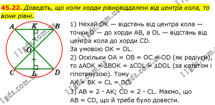 Доведіть, що коли хорди рівновіддалені від центра кола, то вони рівні. 1) Нехай OK — відстань від центра кола — точки O — до хорди AB, a OL — відстань від центра кола до хорди CD. За умовою OK = OL. 2) Оскільки OA = OB = OC = OD (як радіуси), то ∆AOK = ∆BOK = ∆COL = ∆DOL (за катетом і гіпотенузою). Тому AK = BK = CL = DC. 3) AB = 2 ∙ AK; CD = 2 ∙ CL. Маємо, що AB = CD, що й треба було довести.