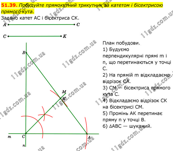 Побудуйте прямокутний трикутник за катетом і бісектрисою прямого кута. Задано катет AC і бісектриса CK. План побудови. 1) Будуємо перпендикулярні прямі m і n, що перетинаються у точці С. 2) На прямій m відкладаємо відрізок CA. 3) CM — бісектриса прямого кута С. 4) Відкладаємо відрізок CK на бісектрисі CM. 5) Промінь AK перетинає пряму n у точці В. 6) ∆ABC — шуканий.