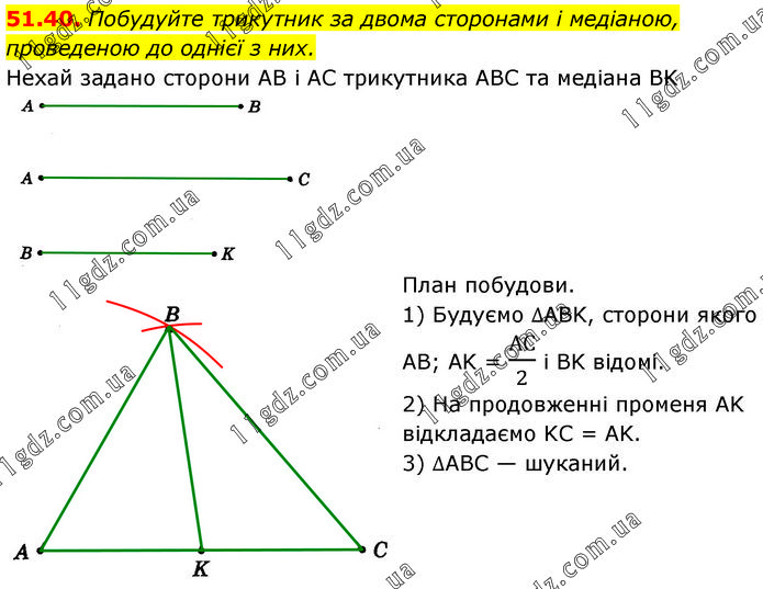 Побудуйте трикутник за двома сторонами і медіаною, проведеною до однієї з них. Нехай задано сторони AB і AC трикутника ABC та медіана BKю План побудови. 1) Будуємо ∆ABK, сторони якого AB; AK = АС/2 і BK відомі. 2) На продовженні променя AK відкладаємо KC = AK. 3) ∆ABC — шуканий.