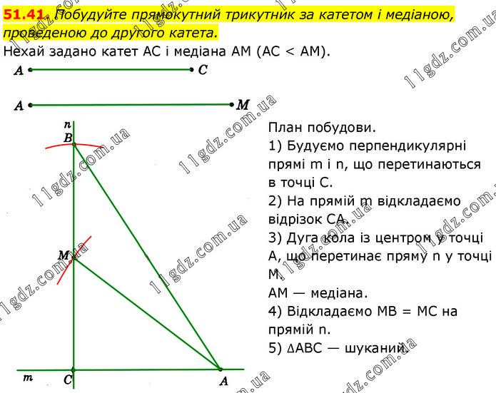 Побудуйте прямокутний трикутник за катетом і медіаною, проведеною до другого катета. Нехай задано катет AC і медіана AM (AC < AM). План побудови. 1) Будуємо перпендикулярні прямі m і n, що перетинаються в точці С. 2) На прямій m відкладаємо відрізок CA. 3) Дуга кола із центром у точці А, що перетинає пряму n у точці М. AM — медіана. 4) Відкладаємо MB = MC на прямій n. 5) ∆ABC — шуканий.