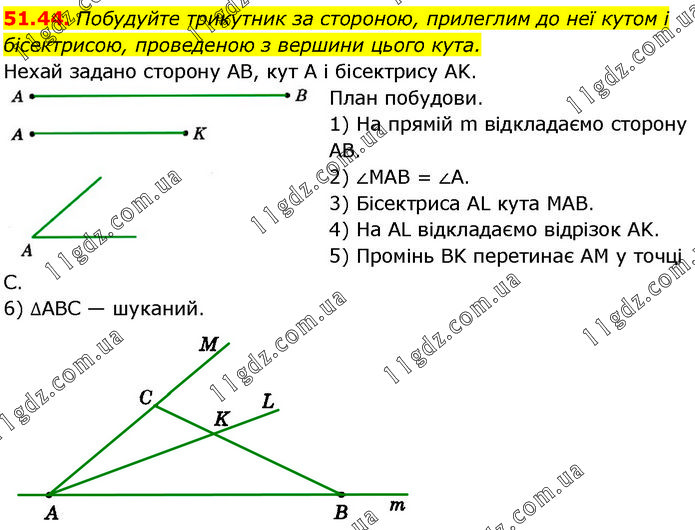 Побудуйте трикутник за стороною, прилеглим до неї кутом і бісектрисою, проведеною з вершини цього кута. Нехай задано сторону AB, кут А і бісектрису AK. План побудови. 1) На прямій m відкладаємо сторону AB. 2) ∠MAB = ∠A. 3) Бісектриса AL кута МАВ. 4) На AL відкладаємо відрізок AK. 5) Промінь BK перетинає AM у точці С. 6) ∆ABC — шуканий.