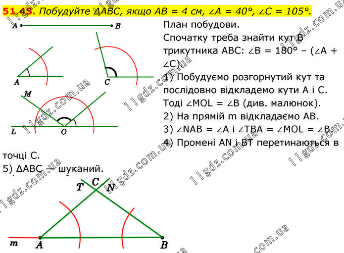 Побудуйте ΔABC, якщо AB = 4 см, ∠A = 40°, ∠C = 105°. План побудови. Спочатку треба знайти кут В трикутника ABC: ∠B = 180° – (∠A + ∠С). 1) Побудуємо розгорнутий кут та послідовно відкладемо кути A і C. Тоді ∠MOL = ∠B (див. малюнок). 2) На прямій m відкладаємо AB. 3) ∠NAB = ∠A і ∠TBA = ∠MOL = ∠B. 4) Промені AN і BT перетинаються в точці С. 5) ∆ABC — шуканий.