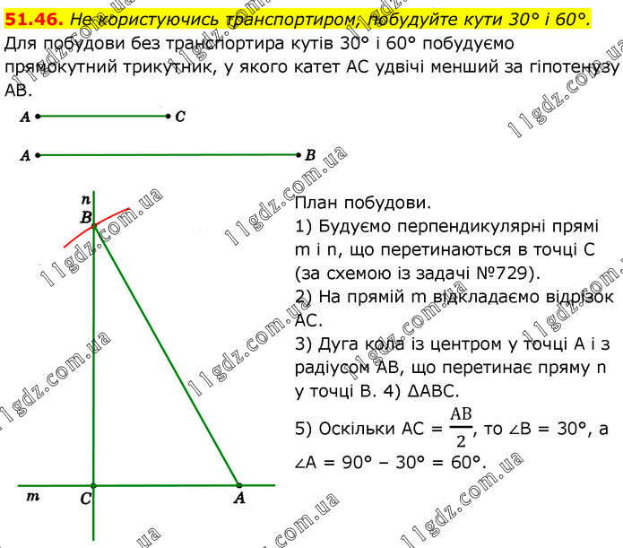 Не користуючись транспортиром, побудуйте кути 30° і 60°. Для побудови без транспортира кутів 30° і 60° побудуємо прямокутний трикутник, у якого катет AC удвічі менший за гіпотенузу AB. План побудови. 1) Будуємо перпендикулярні прямі m і n, що перетинаються в точці C (за схемою із задачі №729). 2) На прямій m відкладаємо відрізок АС. 3) Дуга кола із центром у точці А і з радіусом AB, що перетинає пряму n у точці В. 4) ∆ABC. 5) Оскільки AC = АВ/2, то ∠B = 30°, a ∠A = 90° – 30° = 60°.