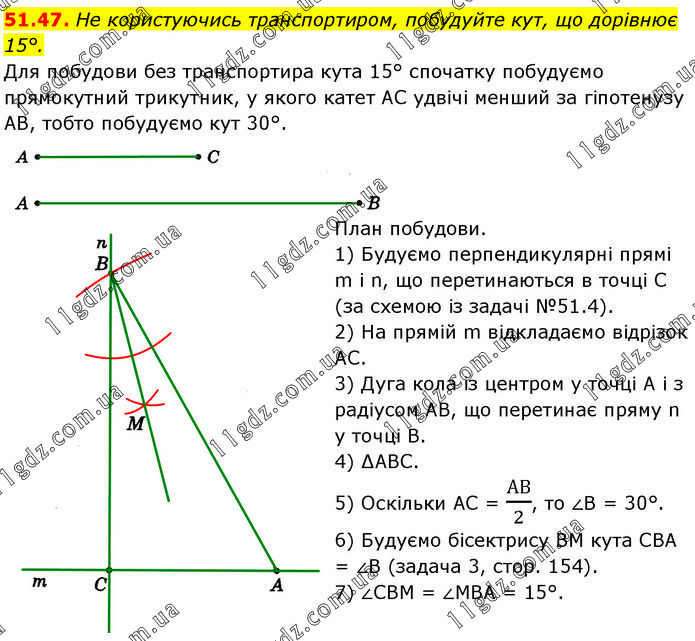 Не користуючись транспортиром, побудуйте кут, що дорівнює 15°. Для побудови без транспортира кута 15° спочатку побудуємо прямокутний трикутник, у якого катет AC удвічі менший за гіпотенузу AB, тобто побудуємо кут 30°. План побудови. 1) Будуємо перпендикулярні прямі m і n, що перетинаються в точці C (за схемою із задачі №51.4). 2) На прямій m відкладаємо відрізок АС. 3) Дуга кола із центром у точці A і з радіусом AB, що перетинає пряму n у точці В. 4) ∆ABC. 5) Оскільки AC = АВ/2, то ∠B = 30°. 6) Будуємо бісектрису BM кута CBA = ∠B (задача 3, стор. 154). 7) ∠CBM = ∠MBA = 15°.