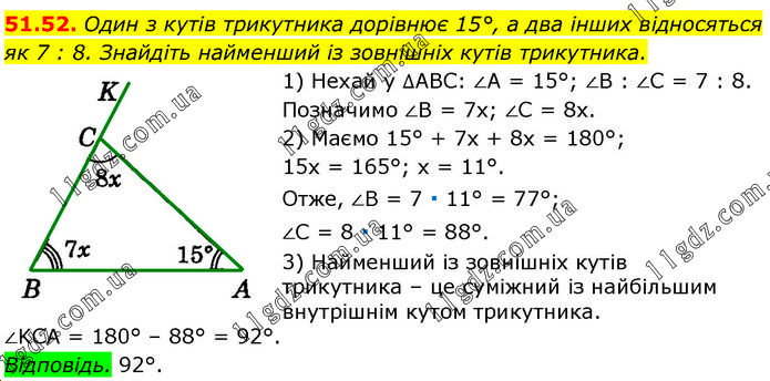 Один з кутів трикутника дорівнює 15°, а два інших відносяться як 7 : 8. Знайдіть найменший із зовнішніх кутів трикутника. 1) Нехай у ∆ABC: ∠A = 15°; ∠B : ∠C = 7 : 8. Позначимо ∠B = 7х; ∠C = 8х. 2) Маємо 15° + 7х + 8х = 180°; 15х = 165°; х = 11°. Отже, ∠B = 7 ∙ 11° = 77°; ∠C = 8 ∙ 11° = 88°. 3) Найменший із зовнішніх кутів трикутника – це суміжний із найбільшим внутрішнім кутом трикутника. ∠KCA = 180° – 88° = 92°. Відповідь. 92°.