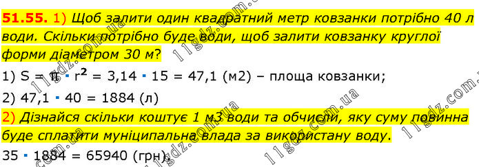 1) Щоб залити один квадратний метр ковзанки потрібно 40 л води. Скільки потрібно буде води, щоб залити ковзанку круглої форми діаметром 30 м? 1) S = π ∙ r2 = 3,14 ∙ 15 = 47,1 (м2) – площа ковзанки; 2) 47,1 ∙ 40 = 1884 (л) 2) Дізнайся скільки коштує 1 м3 води та обчисли, яку суму повинна буде сплатити муніципальна влада за використану воду. 35 ∙ 1884 = 65940 (грн).