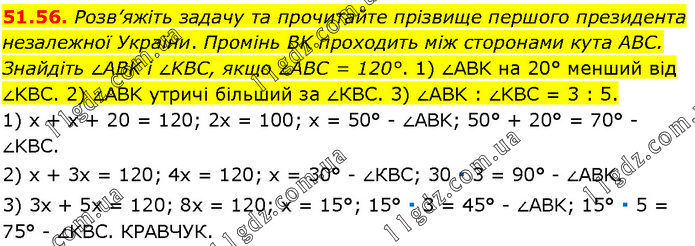 Розв’яжіть задачу та прочитайте прізвище першого президента незалежної України. Промінь BK проходить між сторонами кута ABC. Знайдіть ∠ABK і ∠KBC, якщо ∠ABC = 120°. 1) ∠ABK на 20° менший від ∠KBC. 2) ∠ABK утричі більший за ∠КBC. 3) ∠ABK : ∠KBC = 3 : 5. 1) х + х + 20 = 120; 2х = 100; х = 50° – ∠ABK; 50° + 20° = 70° – ∠KBC. 2) х + 3х = 120; 4х = 120; х = 30° – ∠КBC; 30 ∙ 3 = 90° – ∠ABK. 3) 3х + 5х = 120; 8х = 120; х = 15°; 15° ∙ 3 = 45° – ∠ABK; 15° ∙ 5 = 75° – ∠KBC. КРАВЧУК.